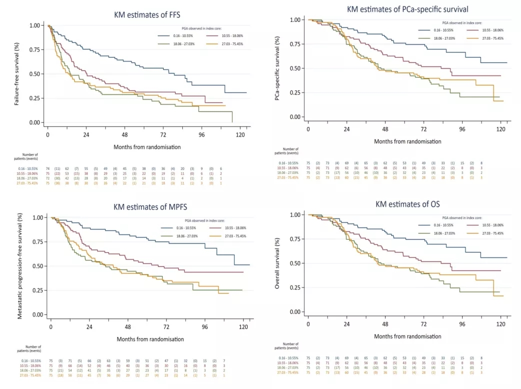 图2. STAMPEDE研究lpWGS分析下PGA与FFS、Pca-特异死亡、MPFS和OS的相关性