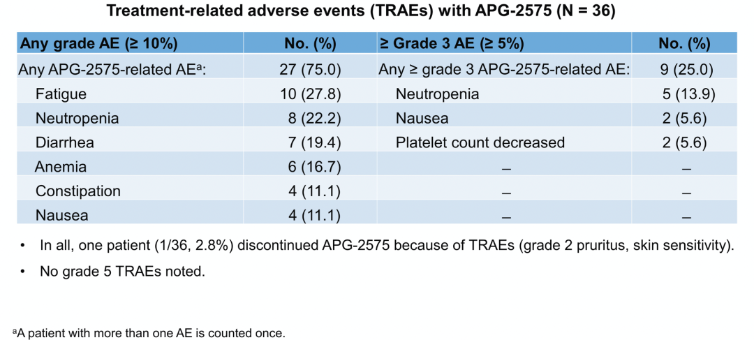 共入组36例患者,诊断包括r/r CLL/SLL (n = 15)、MM (n = 6)、WM/LPL (n = 5)、FL (n = 5)、以及MCL、DLBCL、AML、MDS和HCL各1例。中位治疗6周期,爬坡至最大预定剂量1200 mg/d仍未达到MTD。未观察到DLT、实验室及临床TLS。常见的不良反应(> 10%患者的任何级别TRAE)包括:疲乏(27.8%)、中性粒细胞减少(22.2%)、及腹泻(19.4%)和贫血(16.7%)等。3-4级中性粒细胞减少的发生率为13.9%。在800mg/d及以上剂量组,发生3-4级TRAE也不常见。全部患者中只有1例患者因TRAE(2级皮疹)行药物减量(图2)。