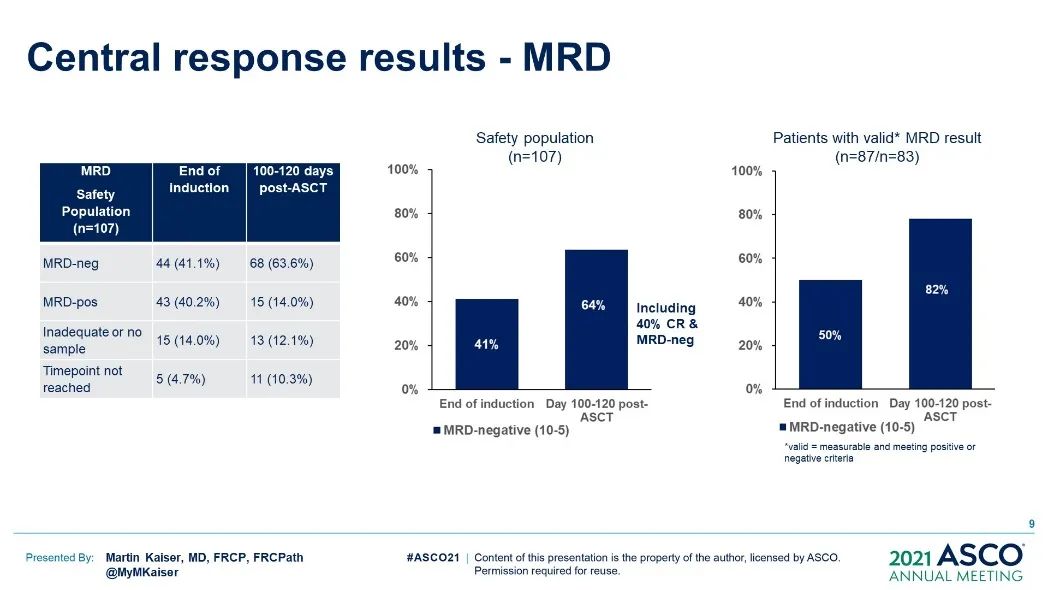 安全人群中107名患者的中位随访时间为22.2个月(95%置信区间:20.6-23.9)。两名患者在诱导期间因感染死亡。诱导结束时可从81%的患者中获取适合通过流式细胞术(10-5灵敏度)进行MRD评估的骨髓抽吸物,ASCT后100天时这一患者比例为78%。诱导治疗结束后,意向治疗人群的响应为94%总缓解率(ORR),22%完全缓解(CR)、58%极佳部分缓解(VGPR)、15%部分缓解(PR)和1%疾病进展(PD),5%的患者未能到达时间点(timepoint not reached,TNR:退出、不符合标准或死亡)。ASCT后100天时ORR为83%,CR为47%,VGPR为32%,PR为5%,PD为7%,TNR为10%(见图1)。