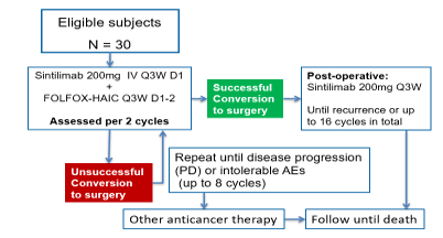 研究入组30例初诊肝癌患者,治疗前经穿刺病理证实为HCC,主要入组标准包括:肿瘤局限于半肝,伴门静脉癌栓(Vp1-Vp3)和/或肝静脉侵犯,无肝外转移,KPS评分≥90,Child-Pugh A级。主要研究终点为按RECIST 1.1评估的无进展生存期(PFS,定义为首次治疗至疾病进展或术后复发或死亡的时间,以先发生者为准)。次要终点包括客观缓解率(ORR)、疾病控制率(DCR)、手术转化率、总生存(OS)、安全性等。患者接受信迪利单抗 200mg IV D1 + FOLFOX-HAIC D2-3 Q3W治疗,每2周期评估,如果达到PR或SD伴肿瘤明显缩小,MDT评估后实施转化手术,术后接受信迪利单抗单药200mg IV Q3W辅助治疗直至复发或不可耐受毒性,信迪利单抗最多用药16次。未成功转化手术的患者,则继续接受FOLFOX-HAIC及信迪利单抗的联合治疗(最多8个疗程),直至疾病进展或不可耐受毒性。患者出现影像学证实的疾病进展前不接受方案以外的其他抗癌治疗,所有患者随访至死亡。
