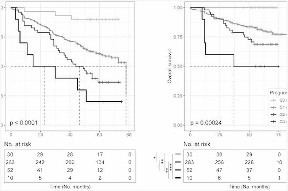 在用包括外周血中CTC的百分数、ISS、LDH和FISH检测的细胞遗传学的多变量分析中,CTC的定量仍被确定为与PFS最相关的预后因素。根据先前定义的CTC界值进行的风险度分层,对包括FISH标危患者在内的所有风险组的预后都有预测价值(0和1组的PFS NR对比2组和3组分别为44个月和30个月:P=0.005)。