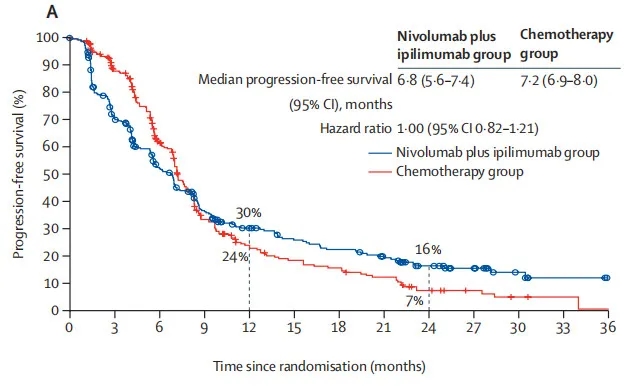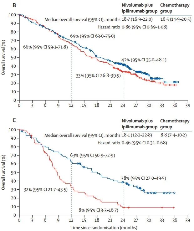 OS延长4个月,2年OS达41%:在总人群中,纳武利尤单抗联合伊匹木单抗与化疗相比显著改善了OS,中位OS分别为18.1个月 vs. 14.1个月 (HR=0.74;96.6% CI: 0.60~0.91;P=0.002),2年OS率分别为41% vs. 27%。双免疫组相比化疗组降低死亡风险26%,延长生存期4个月。