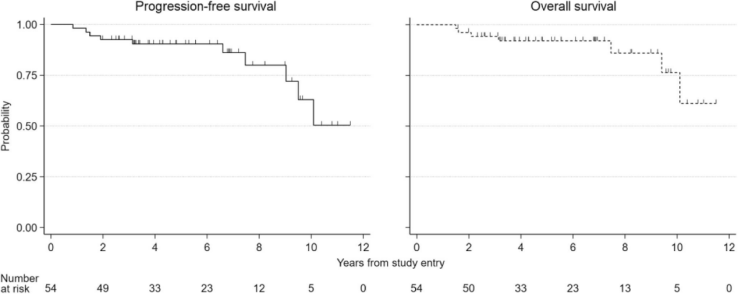 54例Ⅰ期(n=32)和Ⅱ期(n=22)PTL初治患者(中位年龄66岁,范围:37-79岁)接受了R-CHOP21方案治疗,53例接受了至少3剂鞘内注射进行CNS预防,48例至少接受了1剂甲氨蝶呤静脉输注,50例接受了预防性放疗。研究未观察到预期外副作用。中位随访5年,7例患者疾病进展,7例死亡,5年PFS率88%(95%CI,74-94%),5年OS率92%(95%CI,79%-97%)。无患者CNS复发;4例同时发生淋巴结与结外复发,后者包括1例患者同时胃肠道和胸膜复发,各有1例患者肾脏、椎管和对侧睾丸(放疗后9年)复发;2例患者仅有结外复发(皮肤和肾上腺);1例患者仅有淋巴结复发。值得关注的是,7例治疗失败的患者中,4例是治疗结束后6-10年期间的晚期复发。患者死亡原因包括淋巴瘤(n=4)、继发性肿瘤(n=1)、脑血管病和未知疾病(n=1)。