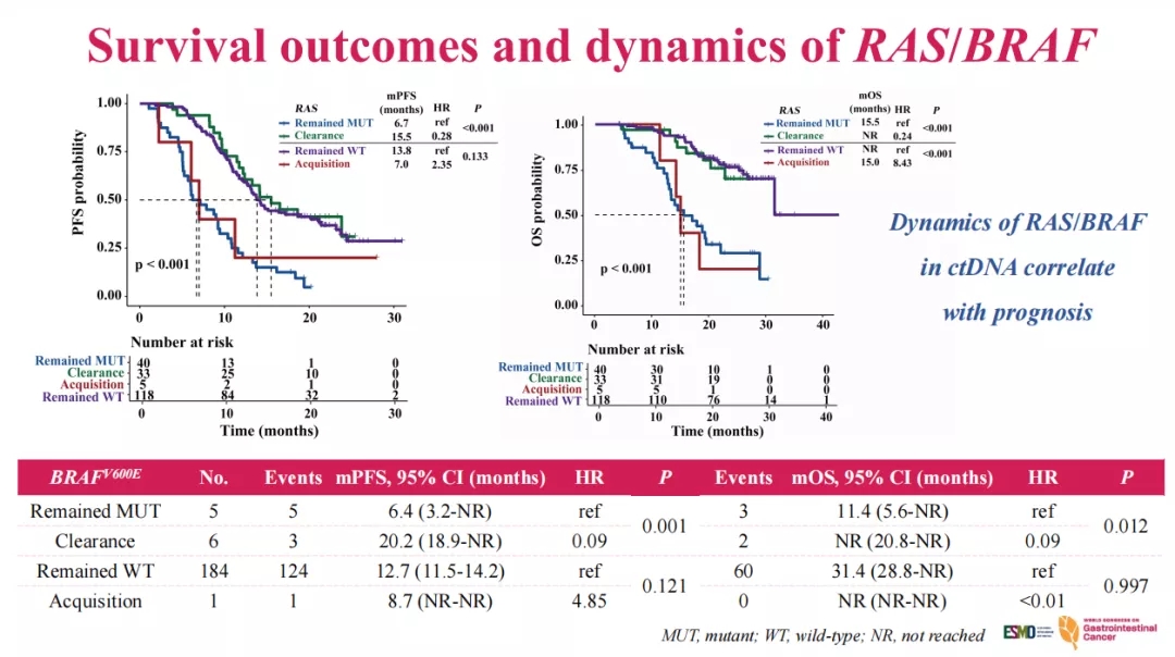 与保持RAS突变(mPFS=15.5个月 vs. 6.7个月,P<0.001;mOS=NR vs. 15.5个月,P<0.001)或BRAF突变(mPFS=20.2 vs. 6.4个月,P=0.001;mOS=NR vs. 11.4个月,P=0.012)的患者相比,血浆RAS或BRAF清除的患者有更好的结局(图2)。