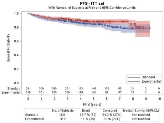 2010年12月至2017年5月期间,在法国和比利时的74个医学中心共招募650例患者,标准组和研究组分别是331例和319例。44%患者>59岁,4%为大包块疾病(>10cm),53%有结外疾病(头颈部51%,消化道17%,睾丸7%,其他25%)。对90.5%病例进行了中心组织学检查。中位随访5.1年(IQR: 3.5-6.5), 87例患者(13.4%)发生PFS事件。标准组的3年PFS为89.2% (95% CI 85.3-92.2),研究组为92.0%(95% CI 88.3-94.5)。研究组与标准组的非劣效性得到证明(风险比0.724,90% CI 0.504-1.040,Com-Nougue检验p值<0.0001)。这项研究同时还检测了研究组的结果是否更优,但未显示研究组结果更优(单侧分层log-rank p=0.0702)。毒性导致的死亡非常罕见,研究组和标准组分别为0和1例。69例患者复发,中位时间25.9个月(4.8-75.7),提示可能发生晚期复发。