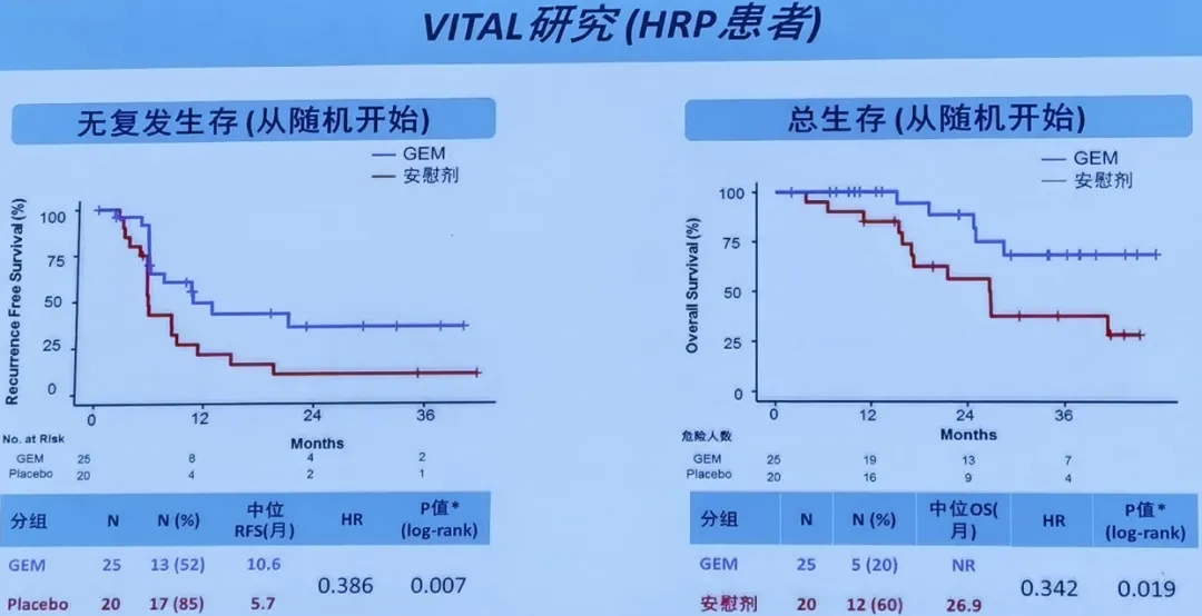 HRP亚组:本次ASCO会议报告了HRP亚组的分析结果:从随机分组开始,GEM治疗组中的HRP患者(n=25)较安慰剂组中的HRP患者(n=20)的中位RFS(10.6个月vs.5.7个月)与OS(NR vs.26.9个月)有显著改善。