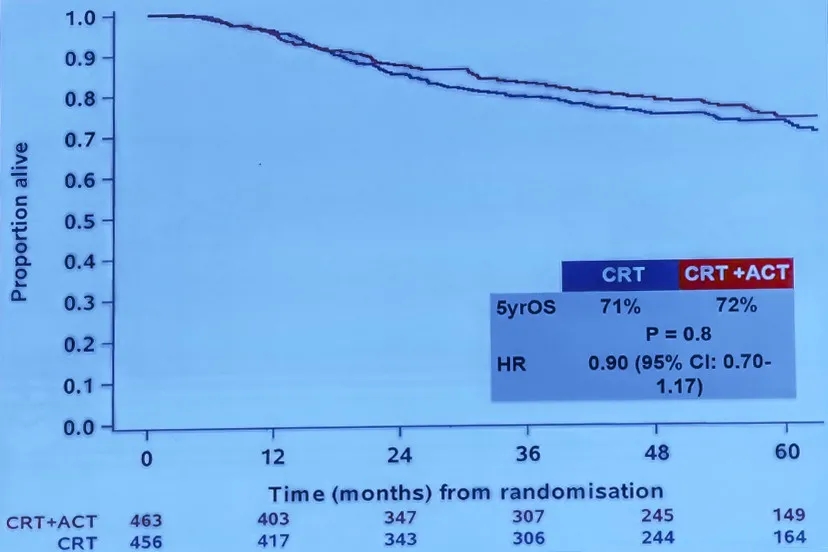 OUTBACK试验的结果表明,标准顺铂放化疗后行辅助化疗并不能改善OS或PFS:5年OS分别为72% vs. 71%(HR=0.90; 95%CI:0.70-1.17;P=0.8);5年PFS分别为63% vs. 61%(HR=0.87;95%CI:0.69-1.07,P=0.61)。两组的疾病复发情况相似。