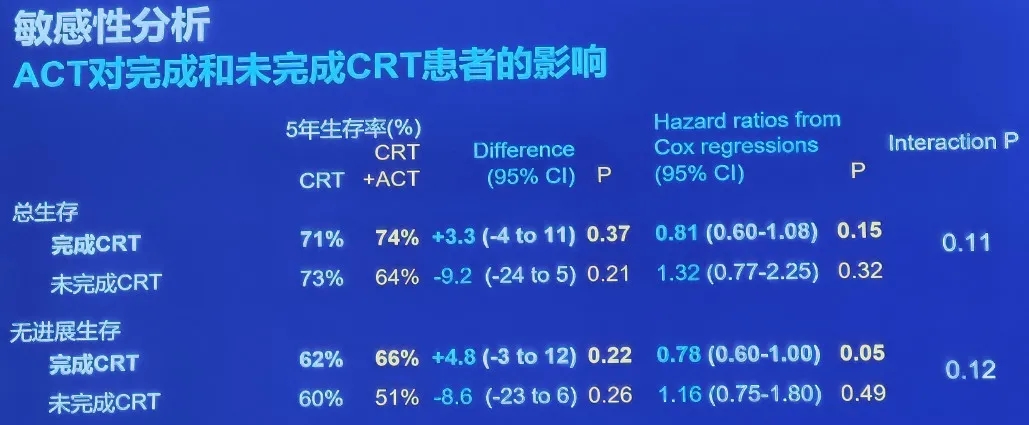 缺陷:随机在CRT前已完成,22%的患者未按计划开始ACT,结局好于预期,受试者仅来源于高收入国家,未遵循治疗方案者的敏感性分析存在偏倚。