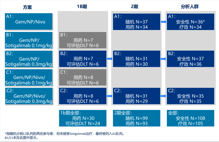 Sotigalimab(APX005M)是一种在研的新型CD40激动性单克隆抗体,通过激动CD40增强抗肿瘤免疫应答,在多种实体瘤临床前研究中,Sotigalimab联合其它治疗体现了更好的效应。此前一项临床Ib期研究显示,Sotigalimab联合吉西他滨+白蛋白紫杉醇±纳武利尤单抗,对转移性胰腺导管腺癌(PDAC)初治患者有临床活性,24例可评价疗效患者的客观缓解率(ORR)为58%,推荐用于II期研究的Sotigalimab剂量为0.3mg/kg[1]。