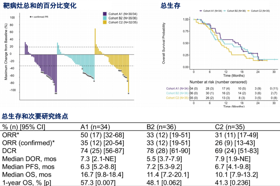 疗效数据显示,A1、B2和C2队列的1年OS率分别为57.3%(与历史生存率35%对比,单侧p=0.007,下同)、48.1%(单侧p=0.062)和41.3%(单侧p=0.236),因此仅有队列A1即纳武利尤单抗+化疗方案达到预设的主要终点。总生存曲线、靶病灶总和的百分比变化,次要终点的各项疗效指标数据见图3。