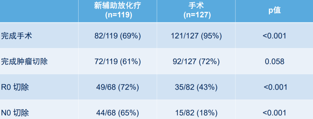 两组患者基线特征可比,可切除/临界可切除的比例均接近55%:45%,完成手术和切除比例、R0切除率等指标如表3所示,新辅助放化疗组患者的R0切除、N0切除率显著更高。