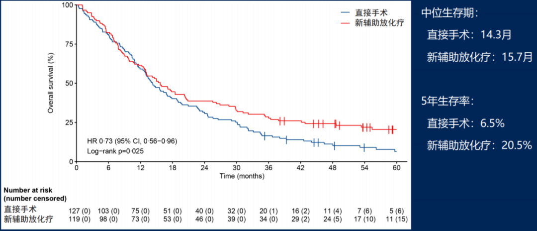在中位时间56个月的随访后,ITT人群的OS数据如图6所示,新辅助放化疗组中位OS为15.7个月,显著优于立刻手术组的14.3个月(HR=0.73, 95% CI: 0.56-0.95, p=0.025),两组3年生存率分别为27.7%和16.5%,5年生存率分别为20.5%和6.5%,且无病生存期(DFS HR=0.70, p=0.009)、无局部治疗失败生存期(LFFI HR=0.57, p=0.004)和无远处转移生存期(DMFI HR=0.74, p=0.071)均提示新辅助放化疗可改善患者临床结局。