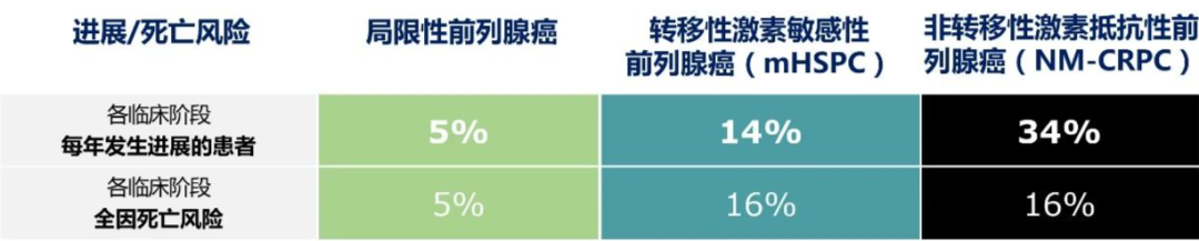 Δ局限性前列腺癌的年进展和死亡风险为5%,而一旦进入mHSPC和NM-CRPC,死亡风险增加3倍[9]