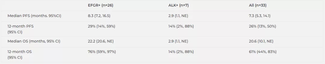 研究获得30例患者的PD-L1表达情况,17例为PD-L1表达阳性(≥1%)。PD-L1<1%与≥1%的患者之间的生存没有差异。EGFR阳性患者的中位PFS为8.3个月,1年PFS率29%,中位OS为22.2个月,1年OS率为76%;ALK阳性患者的疗效有限,中位PFS和OS均为2.9个月,1年PFS率和1年OS率均为14%。