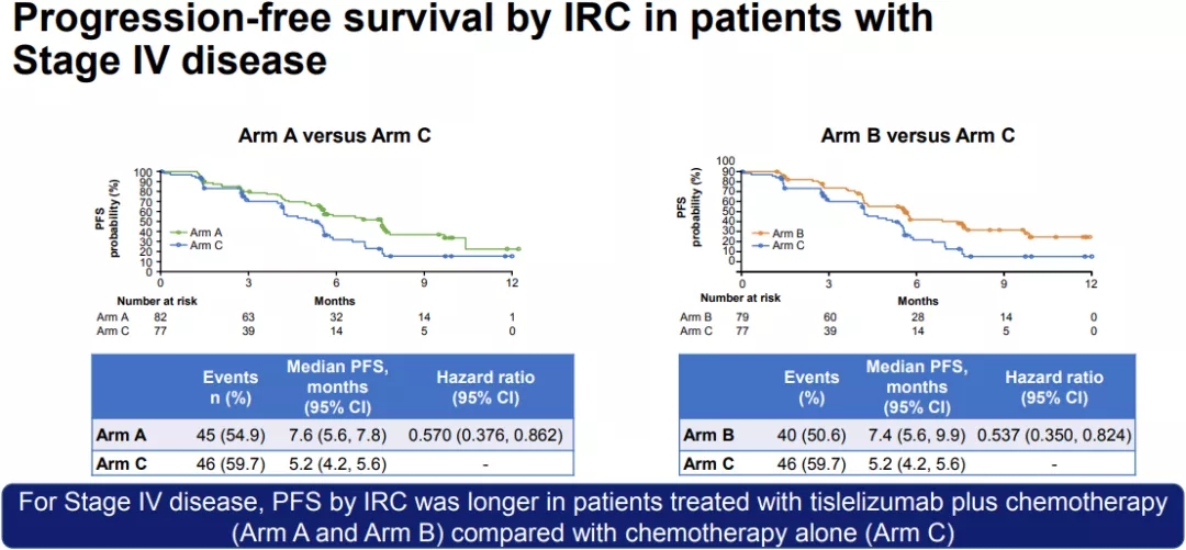 IV期患者队列,A组对比C组的中位PFS分别为7.6个月和5.2个月(HR=0.570;95% CI:0.376-0.862);B组对比C组,中位PFS为7.4个月和5.2个月(HR=0.537;95% CI:0.350-0.824)。