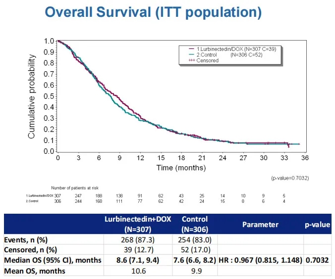 疗效数据:在意向治疗人群中,研究组和对照组的中位OS分别为8.6个月和7.6个月(HR=0.967;95% CI: 0.815-1.148;P=0 .7032)。中位OS分别为 10.6个月和9.9个月。