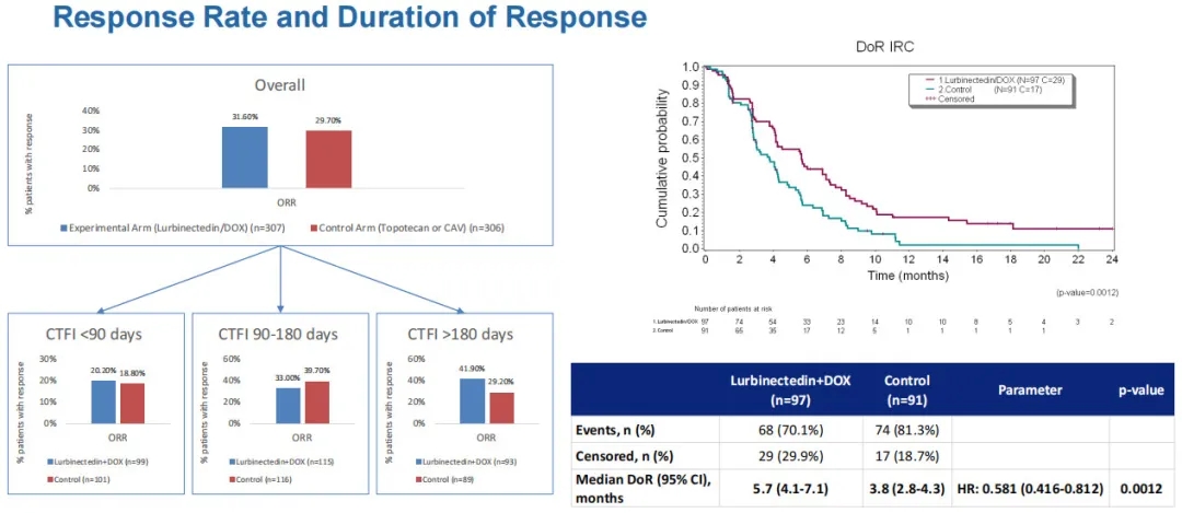 试验组和对照组的ORR分别为31.60%和29.70%。CTFI<90天患者的ORR分别为20.20%和18.80%,CTFI 90-180亚组的ORR分别为33.00%和39.70%,CTFI>180患者的ORR分别为41.90%和29.20%。