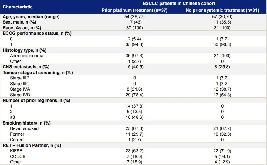 该研究的中国队列共招募了68名患者:37名患者为经铂类化疗的人群,31名既往没有接受过全身治疗。