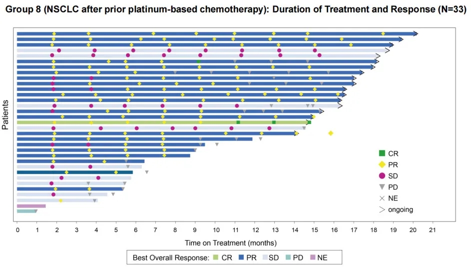 既往接受过化疗的患者:中位随访17.0个月后,总体缓解率 (ORR)为 66.7%(n=22;95% Cl:48.2-82.0)。3% (n=1)的患者获得完全缓解(CR),63.6% (n=21) 达到部分缓解(PR)。至首次应答的中位时间为1.87个月(1.7-3.8)。6个月和9个月持续缓解 (DOR)率分别为77.3% (95% Cl: 59.8-94.8) 和50.0% (95% Cl: 29.1-70.9)。治疗持续时间的中位数为14.65个月(范围:0.9-20.0)。