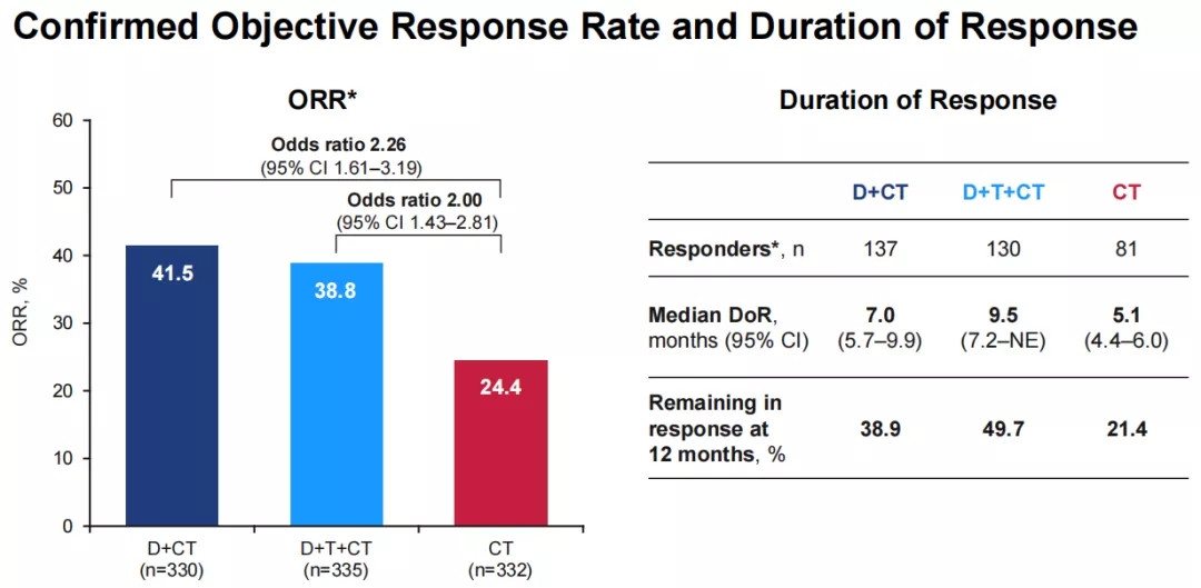 DoR:D+CT组、D+T+CT组及CT组的DoR分别为7.0个月(95% CI: 5.7-9.9)、9.5个月(95% CI: 7.2 -NE)和5.1个月(95% CI: 4.4-6.0)。各组人群在治疗1年时分别有38.9%、49.7%和21.4%的患者持续应答。