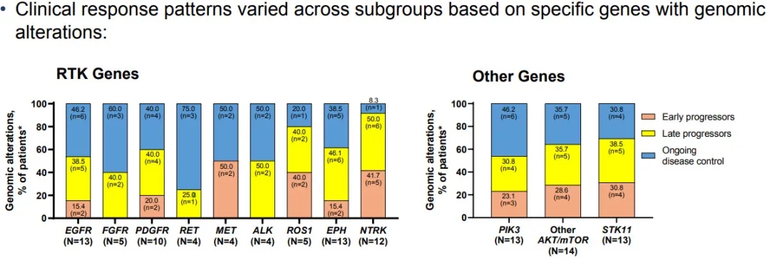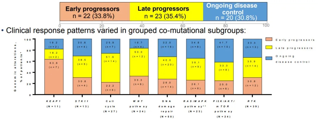 共有33.8% (n=22)的患者是早期进展者(疾病在前3个月进展);35.4% (n=23)是晚期进展者(在3个月或之后发生疾病进展事件);30.8% (n=20) 有持续的疾病控制。然而,研究结果因共突变亚组而异。