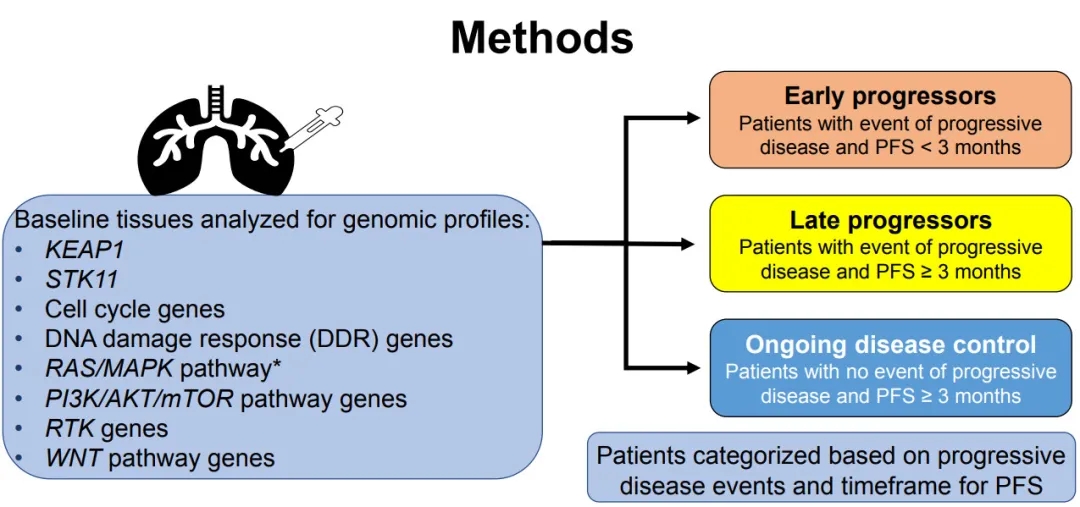 德克萨斯大学MD安德森癌症中心Ferdinandos Skoulidis报告的这项研究中,研究人员对65名具有基线组织样本和至少3个月随访的患者进行组织分析,并查看了以下基因组图谱:KEAP1(n=11);STRK11 (n=13);细胞周期基因(n=27);DNA损伤反应(DDR)基因(n=50);RAS/MAPK通路(n=23);PI3K/AKT/mTOR通路基因(n=24);RTK基因(n=39);WNT通路基因(n=24)。