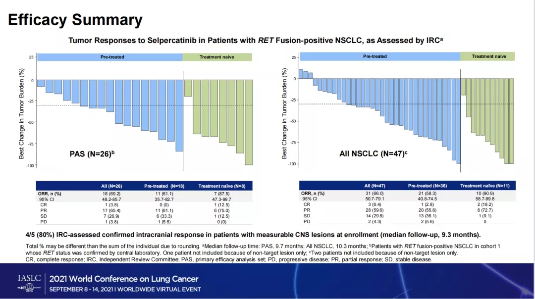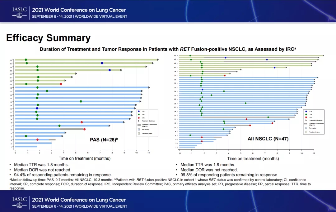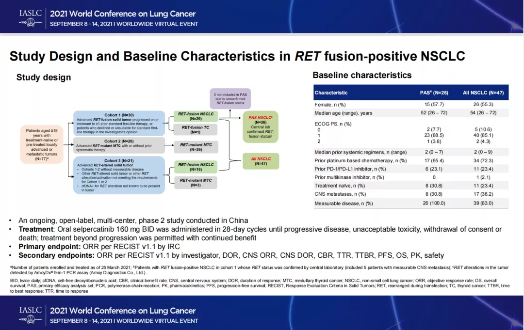 主要研究终点是独立审查委员会(IRC)评估的客观缓解率(ORR;RECIST 1.1)。次要终点包括缓解持续时间(DoR)、CNS ORR、CNS DoR 和安全性。在主要分析集(PAS)中分析疗效,包括中心实验室确认RET状态的RET融合阳性NSCLC患者,以及所有可评估反应的NSCLC患者。值得注意的是,如果观察到持续获益,患者可在疾病进展后继续接受研究方案。