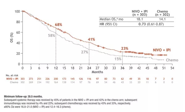 纳武利尤单抗+伊匹木单抗的总体缓解率(ORR)为39.6%,化疗组为44.0%;