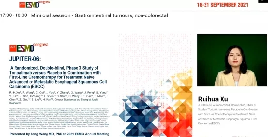 Rui-Hua Xu, et al. JUPITER-06: A randomized, double-blind, phase III study of toripalimab versus placebo in combination with first-line chemotherapy for treatment naive advanced or metastatic esophageal squamous cell carcinoma (ESCC). ESMO 2021, Sep 16-22. Abstract 1373MO.