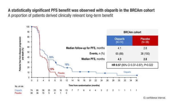 BRCA1/2突变患者队列的一部分患者获得长期获益,因为12个月PFS率达到19%,而安慰剂组为0%。