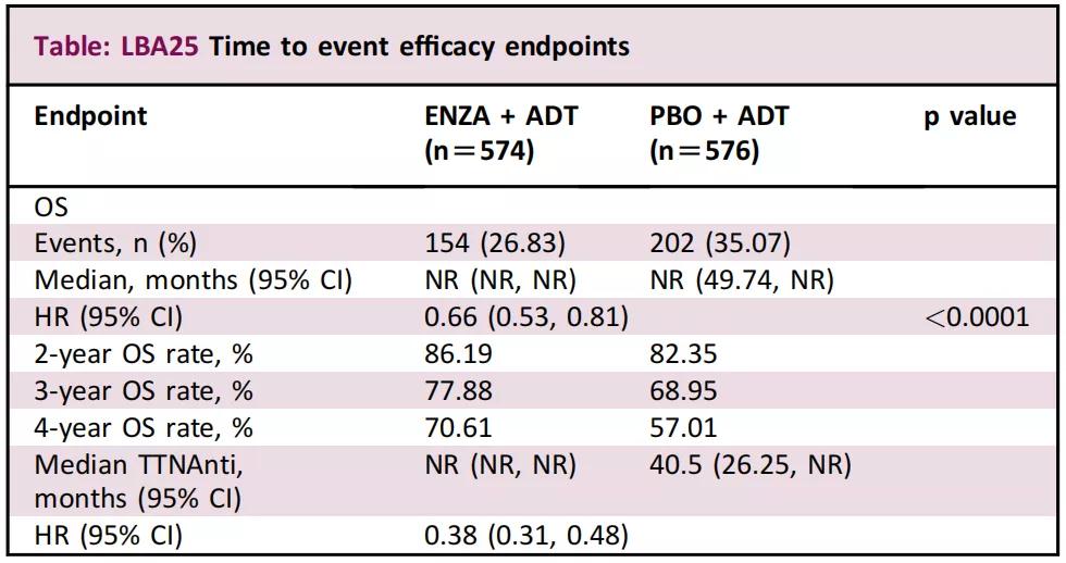 与PBO+ADT相比,ENZA+ADT使患者OS显著延长(HR 0.66;95%CI:0.53~0.81;P<0.0001),在大多数预先指定的亚组中具有类似的结果。与PBO+ADT相比,ENZA+ADT使患者TTNAnti有显著延长。ENZA+ADT与PBO+ADT的安全性结果与初步分析结果一致。