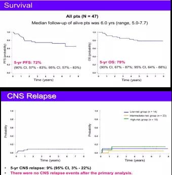 CD5阳性DLBCL预后差,一线标准治疗后常出现中枢神经系统(CNS)复发。一项多中心II期研究评估了DA-EPOCH-R联合HD-MTX一线治疗II-IV期CD5阳性DLBCL的疗效。入组条件包括初诊CD5阳性DLBCL,20-75岁,II-IV期,PS 0-3。入组患者接受4个周期DA-EPOCH-R治疗后序贯2个周期HD-MTX治疗,然后再行4个周期DA-EPOCH-R治疗。研究共入组47名患者,共45例完成全部治疗。既往曾报道该研究中位随访3.1年的结果,2年PFS为79%,2年CNS复发率为9%。2021年ASCO会议上报告了该研究随访6年的结果[7],5年PFS和OS分别为72%和79%,5年CNS复发率9%(如下图),首次结果报导后未再出现新的CNS复发病例。无3/4级迟发毒性和心脏毒性,6例患者发生第二肿瘤。上述结果表明DA-EPOCH-R联合HD-MTX治疗II-IV期CD5阳性DLBCL的疗效与安全性均值得肯定,但CNS复发率仍较高,对CD5阳性患者的中枢预防策略仍有待探索。