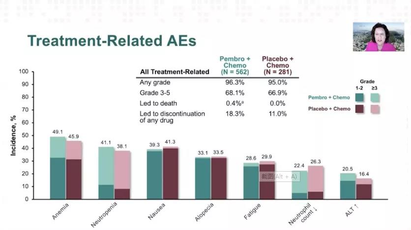 最主要区别是pembrolizumab+化疗组患者免疫相关的不良事件增加,因为PD-1/PD-L1引起的免疫上调不完全针对肿瘤,也会引起其他免疫功能的上调。不良反应有会引起甲状腺功能低下(开始时表现为甲状腺功能亢进),可通过补充甲状腺素片可很容易解决。肺毒性、心毒性发生较少,其他的不良反应,临床上也是可以很好进行处理的。