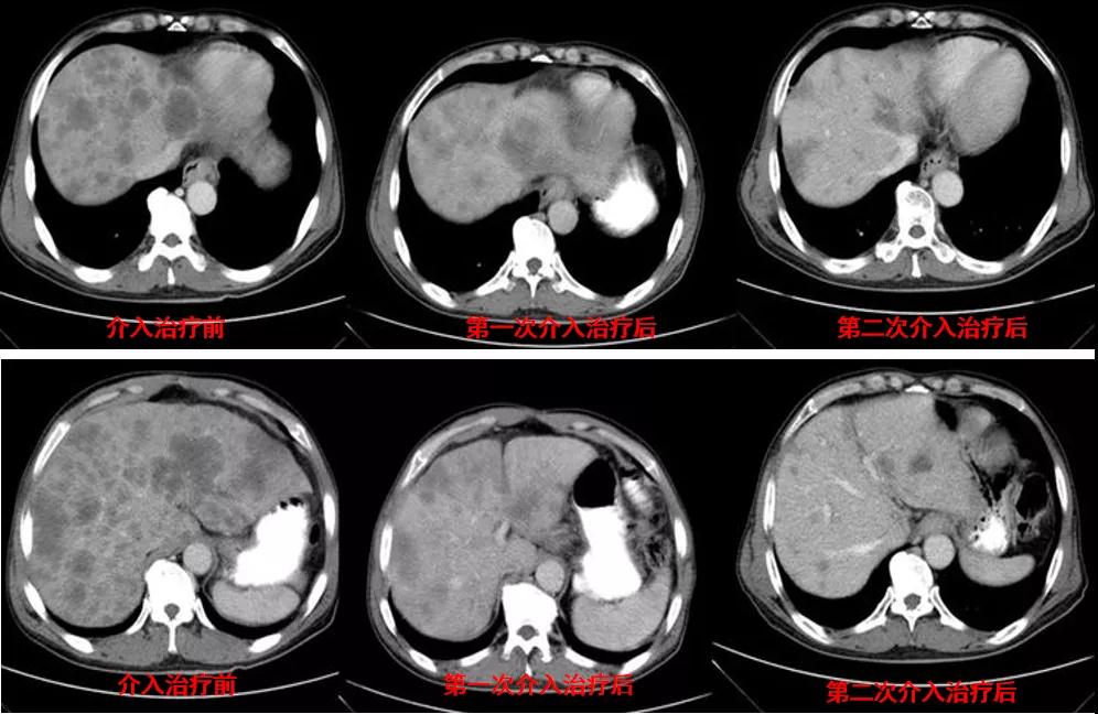 讨论:患者病灶进一步减小,病情控制好,治疗疗效显著且肝转移病灶大于3个,因此不建议行射频消融治疗,建议继续行介入联合靶向治疗。