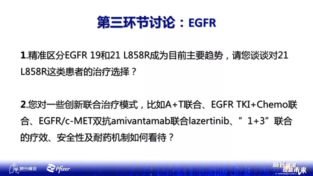 针对第2个问题,讨论嘉宾指出,虽然A+T联合治疗使21 L858R患者的PFS延长,但没有OS显著获益的证据;EGFR TKI与化疗联合会导致不良反应大幅增加;EGFR/c-MET双抗amivantamab联合lazertinib方案考虑到了可能发生的耐药机制,提前联合使用可克服耐药的药物;‘1+3’联合方案还需进一步检验,同时应考虑患者的经济负担。大家一致认为,联合治疗方案应平衡疗效、副作用和经济负担,并重视NGS检测结果的指导作用。