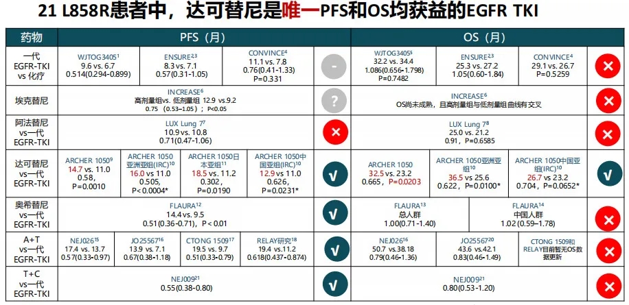 对于21 L858R突变mNSCLC患者,目前达可替尼是实现了在无进展生存(PFS)和总生存(OS)均获益的EGFR TKI。ARCHER 1050研究结果显示,达可替尼较一代EGFR TKI显著延长21 L858R人群的OS 9.3个月(中位OS:32.5个月vs 23.2个月),死亡风险降低33.5%(HR=0.665; 双侧p=0.0203);其中亚洲患者的死亡风险降低38%。2020年Future Oncol发表的EGFR TKI网络荟萃分析发现,在21 L858R突变患者中,与所有其他EGFR TKI相比,达可替尼显示OS的数值改善。