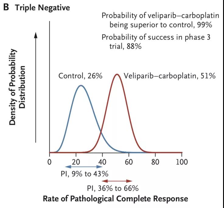 ① BrighTNess研究预设的主要研究终点为pCR,包括紫杉醇+卡铂+Veliparib组vs. 紫杉醇组的pCR率的检验、及紫杉醇+卡铂+Veliparib组vs. 紫杉醇+卡铂组pCR率的检验。而并未包括紫杉醇+卡铂组vs. 紫杉醇组,因此对该两组的pCR率比较为研究的事后分析(post hoc analysis)。