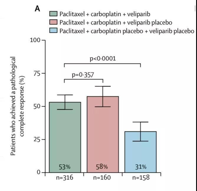 2018年发表于Lancet的BrighTNess研究结果提示(图3),紫杉醇+卡铂组的pCR率显著高于紫杉醇单药组(58% vs 31%, p<0.0001),但紫杉醇+卡铂+Veliparib组与紫杉醇+卡铂组的pCR率无显著性差异(53% vs 58%, p=0.36),说明pCR率的获益来源于卡铂而非Veliparib。