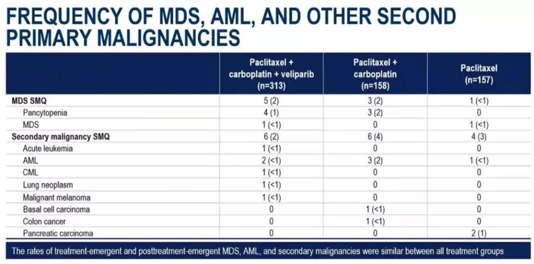 各治疗组间组骨髓增生异常综合征(MDS)、急性髓性白血病(AML)和第二原发肿瘤的发生率无明显差异(图5),加用卡铂后血液学毒性虽略增高,但考虑到加用卡铂后pCR率及EFS的显著获益,研究者仍推荐在TNBC新辅助治疗中加用卡铂。