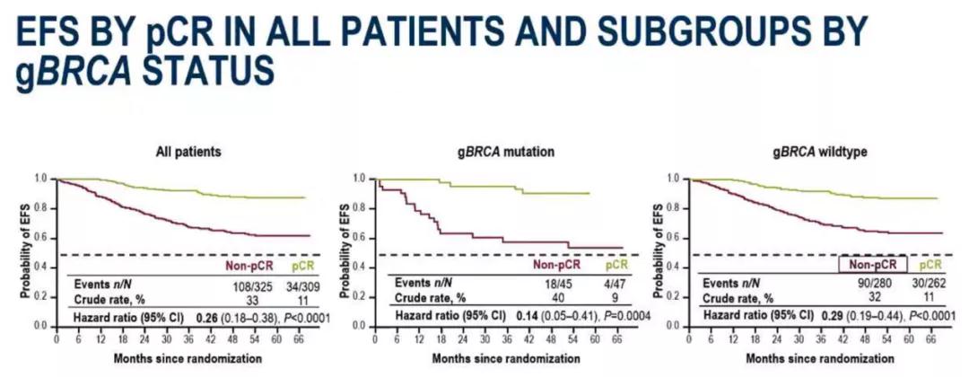 此外,研究发现,无论患者是否存在gBRCA突变,新辅助后达到pCR都提示更长的EFS(图6)。因此,研究者建议,对于II-III期的TNBC,无论gBRCA是否突变,都可以在新辅助治疗中加用卡铂。