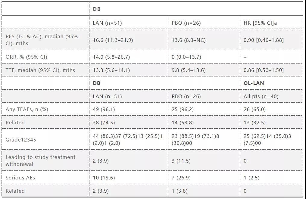 在DB和OL期间,LAN组的中位PFS为16.6(95%CI:12.8~21.9)个月,其中TC患者为21.9(12.8~NC)个月;AC患者为14.1(5.6~16.6)个月。在DB期的TC患者中,LAN组和安慰剂组的PFS分别为21.9(13.8~NC)个月和13.9(13.4~NC)个月;在DB期的AC中患者中,LAN组和安慰剂组的分别为13.8(5.6~16.6)个月和11.0(2.8~16.9)个月。其他关键次要终点结果如下表所示。