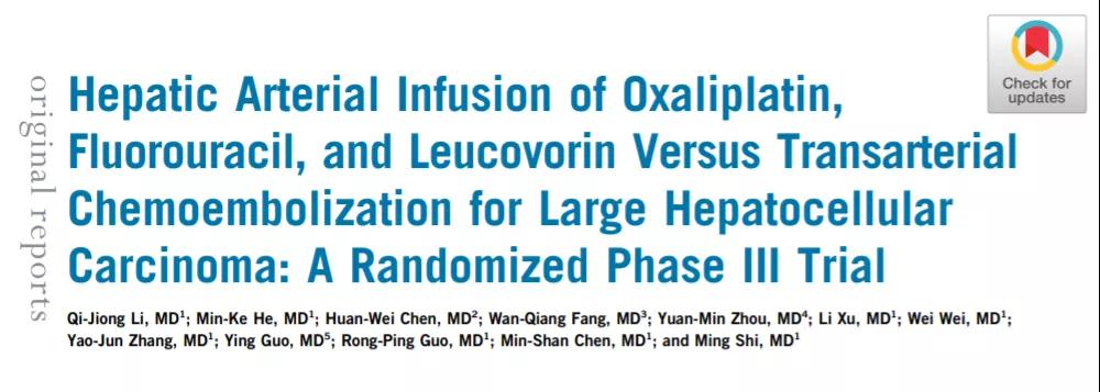 [1]Li QJ, He MK, Chen HW, et al. Hepatic Arterial Infusion of Oxaliplatin, Fluorouracil, and Leucovorin Versus Transarterial Chemoembolization for Large Hepatocellular Carcinoma: A Randomized Phase III Trial [published online ahead of print, 2021 Oct 14]. J Clin Oncol. 2021;JCO2100608. doi:10.1200/JCO.21.00608
