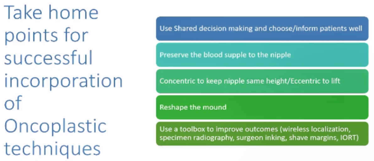 对乳腺癌患者开展的保乳整形手术,应注意以下要点:1)如有必要,去除多余的乳房皮肤;2)保持双侧乳头乳晕复合体(NAC)对称;3)重建完整的乳房轮廓;4)切口应远离肿块切除部位。医生从接诊患者开始,就应对患者特征(年龄、既往治疗史、乳房大小等)、肿瘤特征(位置、组织学类型、分级、有无淋巴结侵犯等)、社会状况及患者治疗意愿和风险进行详尽评估。