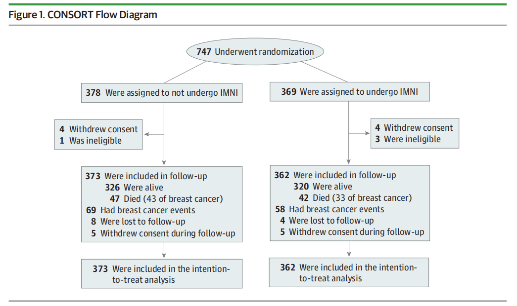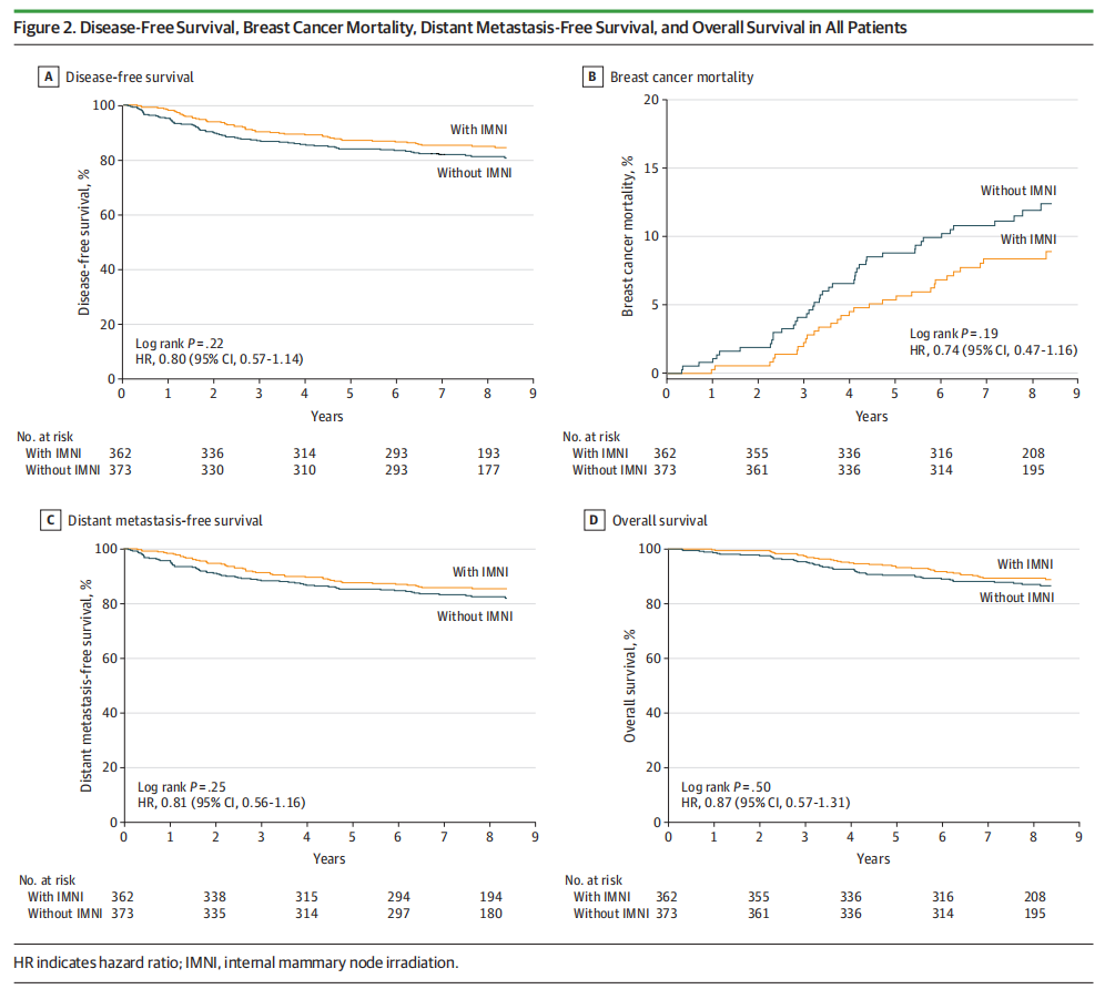 这项随机临床试验发现,在局部淋巴结照射中纳入IMNI并不能显著改善淋巴结阳性乳腺癌患者的DFS。然而,肿瘤位于内侧或中部的患者可能从IMNI的使用中获益。