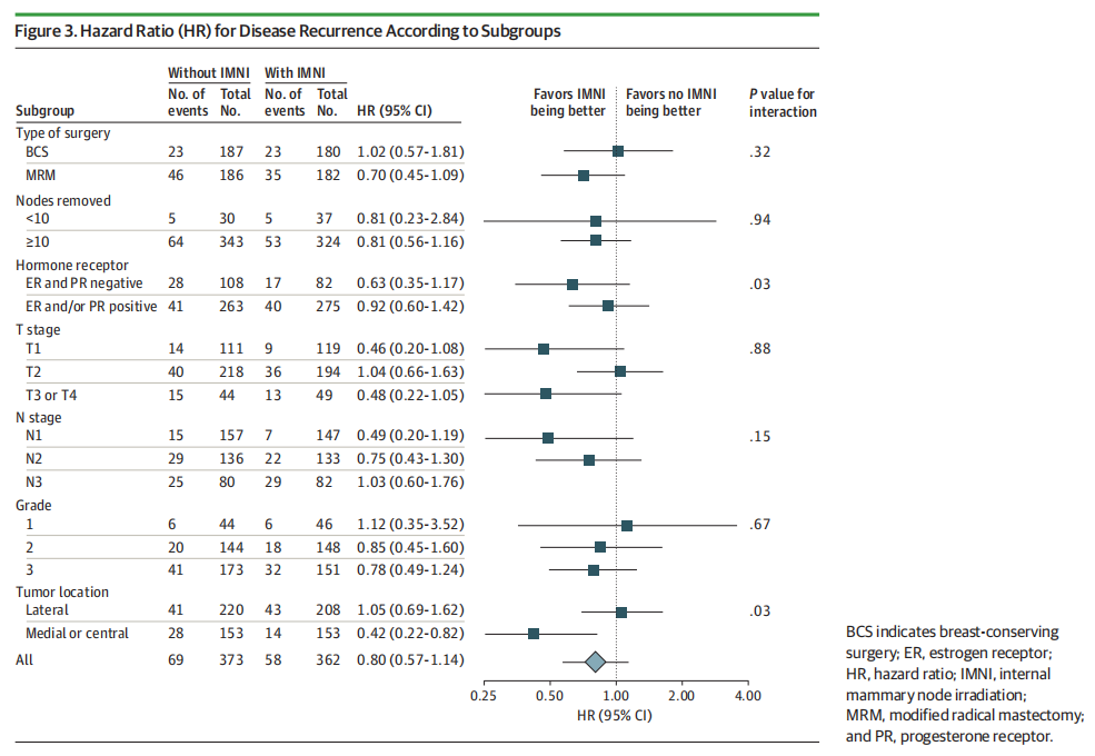 然而,亚组分析显示,肿瘤在中心位置的肿瘤患者中,IMNI组患者的DFS率显著较高。在该亚组中,无IMNI的7年DFS率为81.6%,接受IMNI的7年DFS率为91.8% (HR=0.42;95%CI:0.22~0.82;log-rank P =0.008),无IMNI组7年乳腺癌死亡率为10.2%,IMNI组为4.9%(HR=0.41;95%CI:0.17~0.99;log-rank P=0.04)。两组患者的不良反应发生率无差异,包括心脏毒性反应和放射性肺炎。