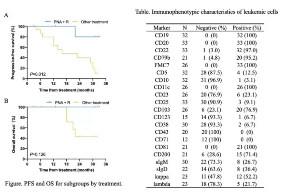 患者诊断时的中位年龄59岁(范围,34-79岁),男性23例,女性10例。腹部肿块和相关体征(n=22)以及异常的全血细胞计数(n=9)是最常见主诉。32例患者(97.0%)存在脾大,其中26例(78.8%)为巨脾;23例(69.7%)和5例患者(15.2%)存在白细胞增多和中性粒细胞减少,中位白细胞计数21.58×109/L(范围,1.34-224.59×109/L)。流式细胞术检测骨髓白血病细胞中位百分比为33%(范围,6.2%-96%),几乎所有患者的单克隆B细胞都表达泛B细胞抗原(CD19、CD20、CD22、CD79b)(表),所有患者的CD11c都是阳性,20/26例患者(76.9%)CD103阳性,30/33例患者(90.9%)CD25阴性,20/26例患者(76.9%)CD23阴性,患者通常表达(15/21,71.4%)CD200。病理方面,20/27例患者(74.1%)骨髓中肿瘤细胞呈间质浸润模式 ,免疫组化Annexin A1均阴性(n=12)。核型分析显示,10/24例患者(41.7%)存在核型异常,其中6例为复杂核型。原位荧光杂交分析显示,4/20例患者(20.0%)存在TP53缺失,5/16例患者(31.3%)存在IGH易位。所有患者BRAF V600E突变都是阴性(n=20)。2/14例患者(16.7%)通过二代测序检测到TP53突变,16/19例患者(84.2%)显示单克隆IGHV重排,最常见的重排片段是VH4-34(n=3,18.8%),6/17例患者(35.3%)IGHV呈未突变状态,使用VH4-34片段的患者IGHV均为未突变状态。最终31例患者需要治疗,治疗选择包括11例患者干扰素-α(IFN-α),5例患者苯丁酸氮芥(CLB),3例患者单独嘌呤核苷类似物(PNA),9例患者PNA+利妥昔单抗,4例接受IFN-α或CLB治疗的患者也接受了脾切除术。接受PNA+利妥昔单抗治疗患者的客观缓解率为100%,接受其他治疗患者为77%。与其他方案相比,PNA+利妥昔单抗治疗患者的完全缓解率更高(75%和12%,p=0.004)。中位随访32个月(范围,3-207),14/29例患者(48.3%)至少经历一次复发或进展,7例(24.1%)患者复发≥2次,值得注意的是,1例患者发生弥漫大B细胞淋巴瘤转化。中位PFS和OS为31个月(95%CI 25.5-36.5)和70个月(95%CI 50.5-89.5)。PNA+利妥昔单抗治疗患者的PFS优于其他治疗患者(3年PFS率80%[95%CI 20-97]和10%[95%CI 1-35],P=0.012,图A),但两组的3年OS率(100%[95%CI 100-100]与43%(95%CI 10-73,P=0.128,图B))没有显著差异。