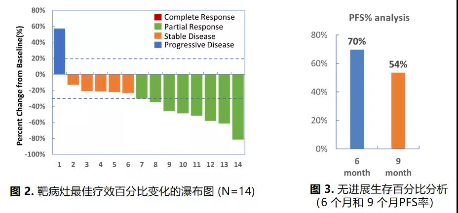 根据RECIST 1.1评估,在14例有可测量疾病的患者中有8例(57%)达到了客观缓解(图2);33 例患者中有23例(70%)达到了6个月PFS,28例患者中有15例(54%)达到了9个月PFS(图3),总体人群的PFS尚未成熟。DCR 为 93%,纳入的 34 名患者中有 5 名因疾病进展而停止治疗。