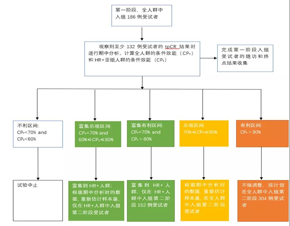 本试验将采用适应性富集设计。适应性设计将分两阶段入组受试者,第一阶段入组186例受试者,包括50%HR阳性的受试者;第一阶段观察到至少132例受试者(包括至少66例HR阳性受试者)的tpCR结果时,将由独立数据监查委员会(IDMC)进行一次正式的期中分析。根据期中分析的结果,进入第二阶段,根据结果将试验划入以下五个区间之一:1.继续在按原计划在人群中进行;2.重新评估原始人群中的样本量 3.利用预先定义的样本量富集HR阳性人群;4.富集HR阳性人群,重新估计样本量,5.试验终止。本研究采用Clopper-Pearson法计算率的95%置信区间。率的组间比较将采用CMH卡方检验。还将采用Miettinen-Nurminen法计算组间率差的95%置信区间。