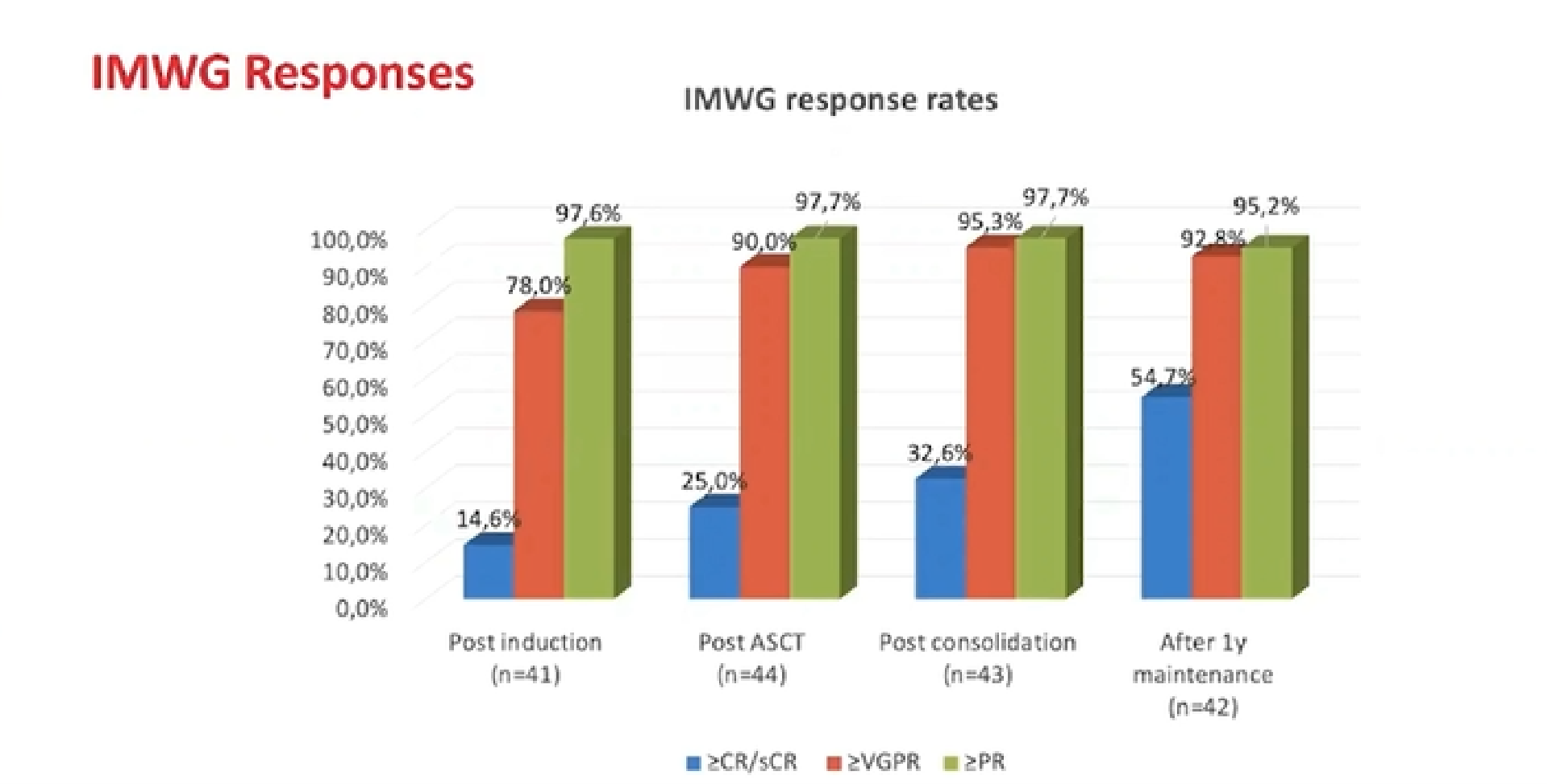 共有44名患者在2018年3月至2021年5月期间入选,其中28例患者首次复发,16例第二次复发。38名患者(86%)曾接触过硼替佐米,8名患者(18%)曾对来那度胺应答不佳。中位年龄为82岁(80-84岁)。所有患者都有虚弱评分≥2。在22名患者中,ISS为I期(n=5)、II期(n=10)或III期(n=7)。11例(32%)患者具有高风险细胞遗传学,包括t(4;14)(n=3)或del17p(n=8)。