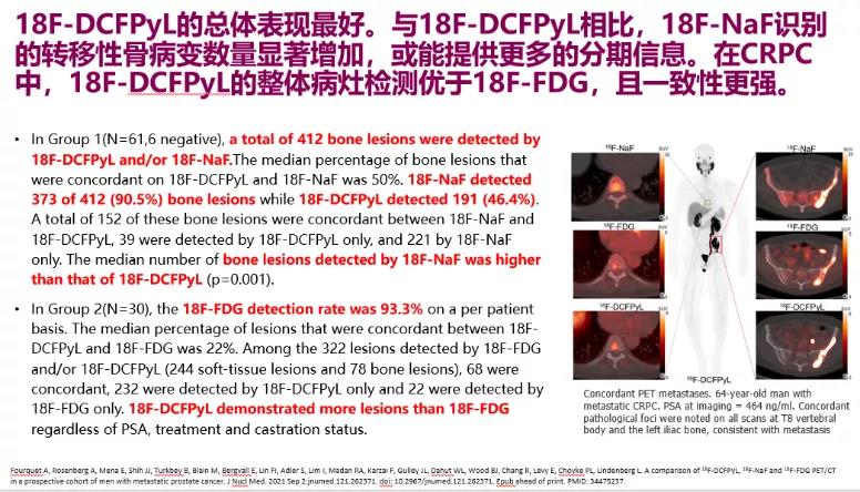 从研究结果来看,18F-DCFPyL总体表现更好,18F-NaF诊断骨转移的阳性率显著增加(但有假阳性的情况出现),18F-FDG PET/CT在CRPC阶段能提供更多的代谢信息,特别是对一些特殊耐药表型的展示,非常有前景。